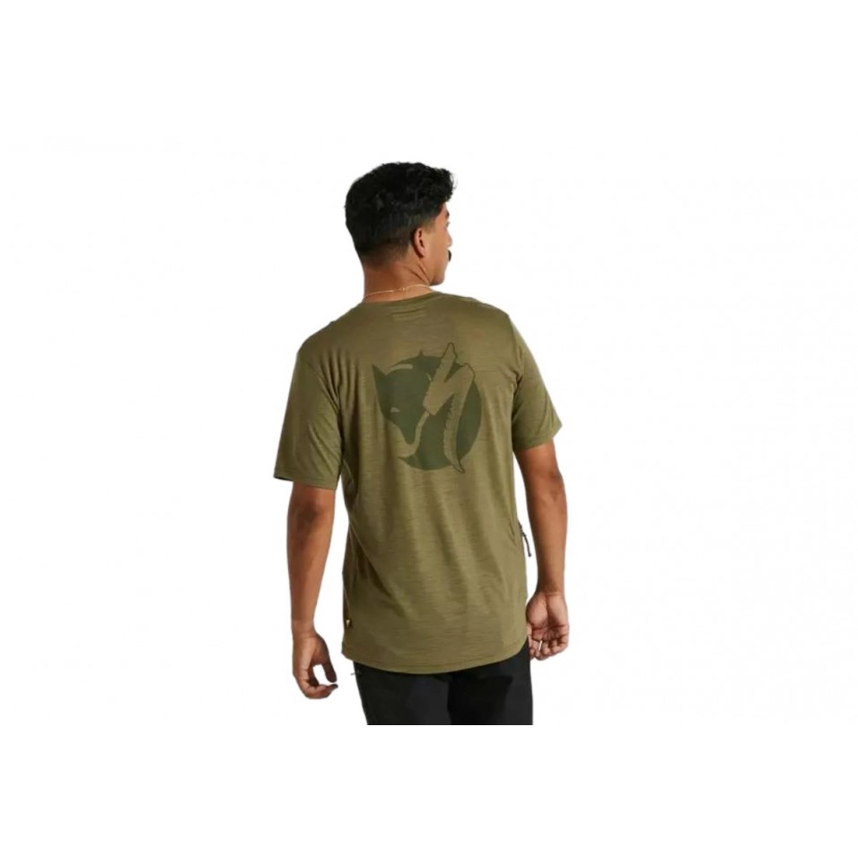 Escapa te presenta la colección que Specialized ha desarrollado en colaboración con la marca sueca Fjällräven. La Camiseta Specialized/Fjallraven Wool Tee Ss Men es una camiseta ligera en lana merino y poliéster reciclado. Combina las propiedades de regulación de la temperatura de la lana con la durabilidad y las propiedades de absorción de la humedad del poliéster. Cuenta con un dobladillo Hi-Low ligeramente más largo en la parte posterior y un bolsillo trasero con cremallera en el lado derecho p